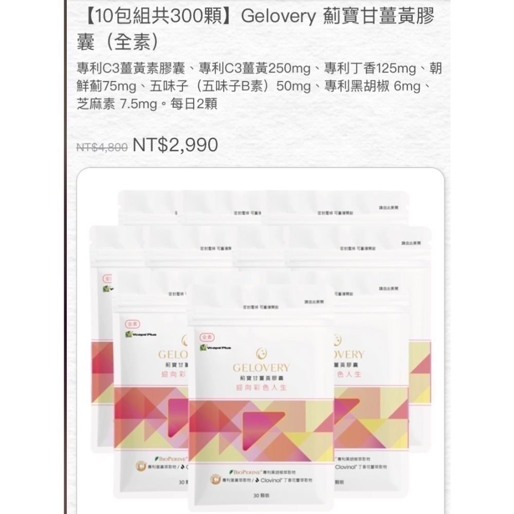 專利C3薑黃素膠囊、專利C3薑黃250mg、專利丁香125mg、朝鮮薊75mg、五味子(五味子B素)50mg、專利黑胡椒 6mg、芝麻素 7.5mg。每日2顆