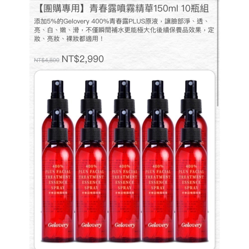 添加5%的Gelovery 400%青春露PLUS原液,讓臉部淨、透、亮、白、嫩、滑,不僅瞬間補水更能極大化後續保養品效果,定妝、亮妝、裸妝都適用!
