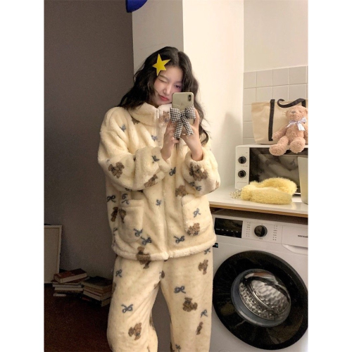 珊瑚絨立領蝴蝶結小熊睡衣+褲子