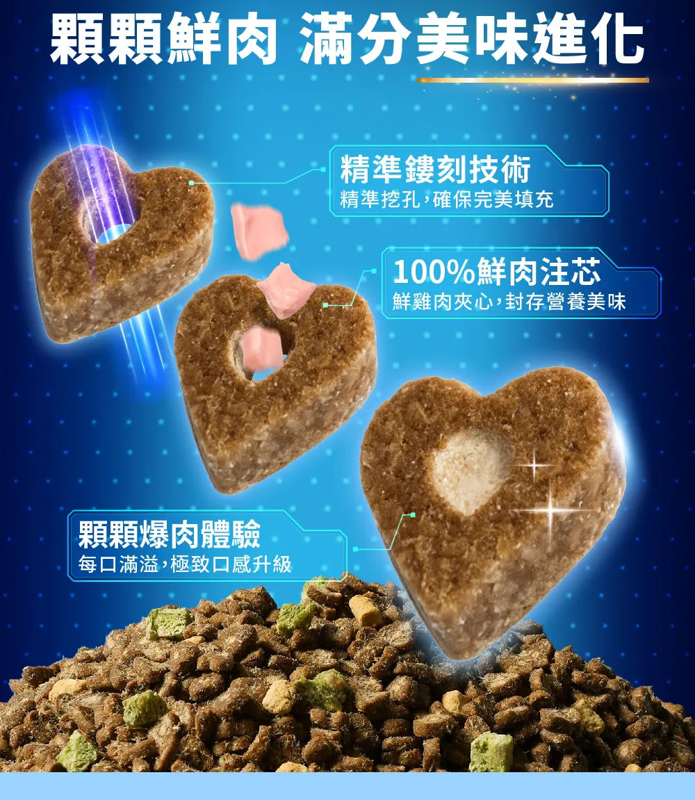 ▸ 100%鮮肉夾心: 每顆愛心飼料夾入鮮香雞肉凍乾,美味再進化