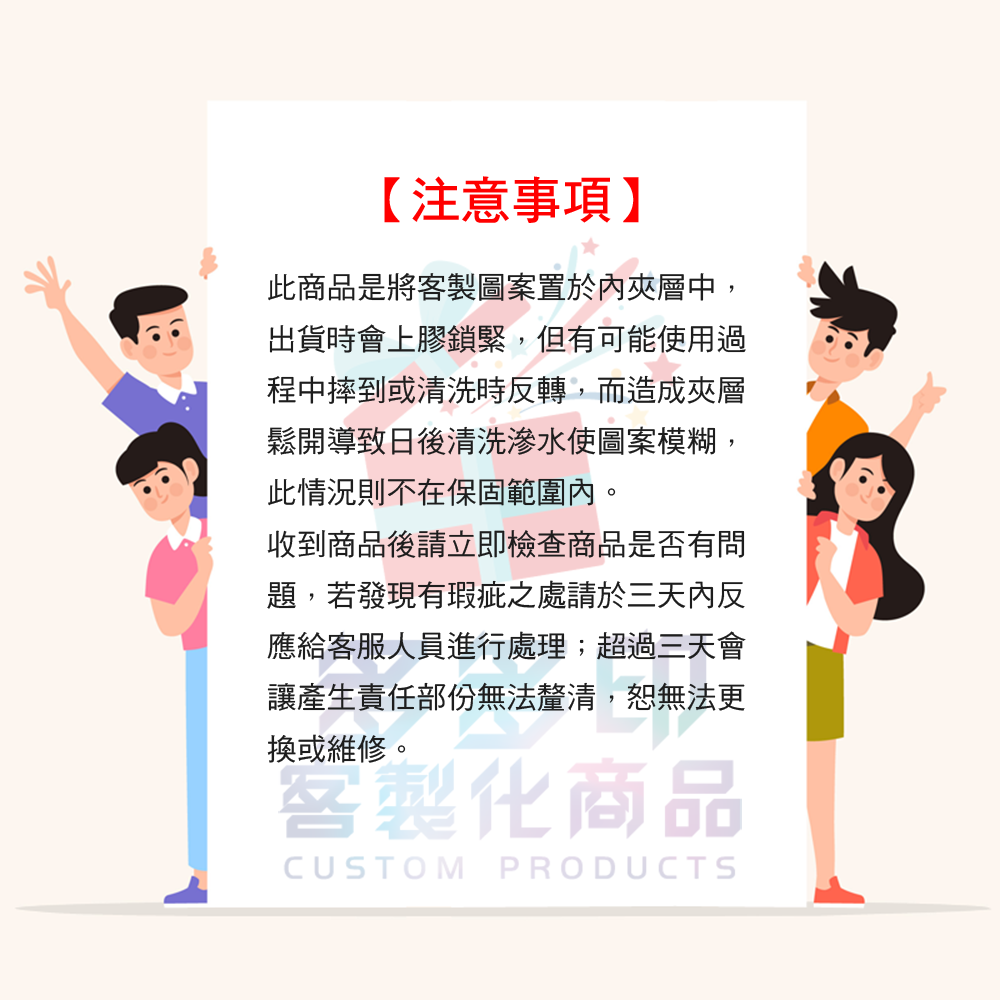 ◆此商品是將客製圖案置於內夾層中,出貨時會上膠鎖緊,但有可能使用過程中摔到或清洗時反轉,而造成夾層鬆開導致日後清洗時滲水使圖案模糊,此情況則不在保固範圍內。