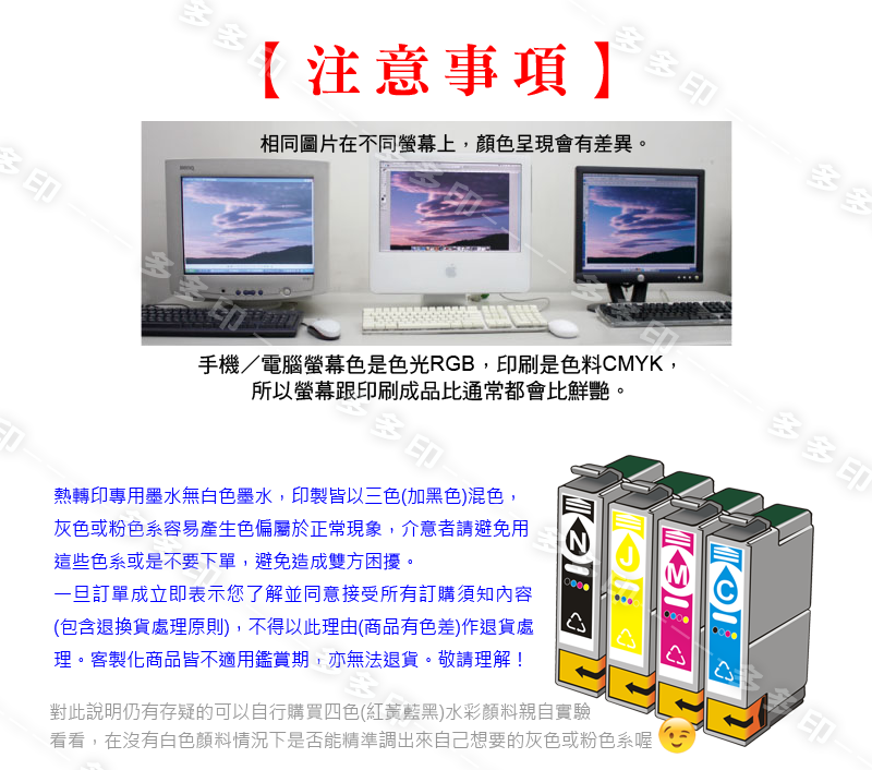 ★由於每個人的電腦、手機、平板螢幕的顏色設置不同,印製出來的顏色與螢幕上看的會有色差。對於顏色要求一模模一樣樣的請勿訂購!