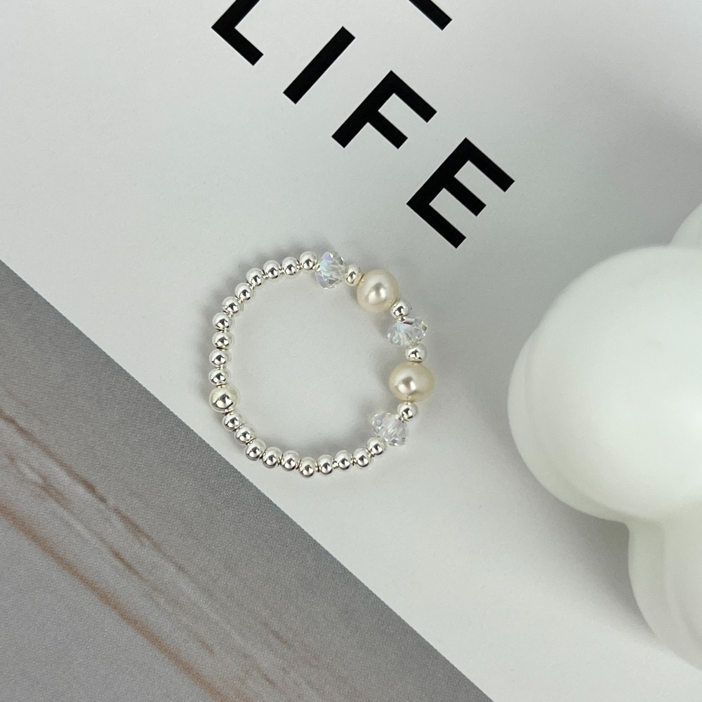 ||董飾 純銀飾品|| 925純銀-(彈力繩戒指)銀圓珠+天然珍珠+水晶 純銀戒指