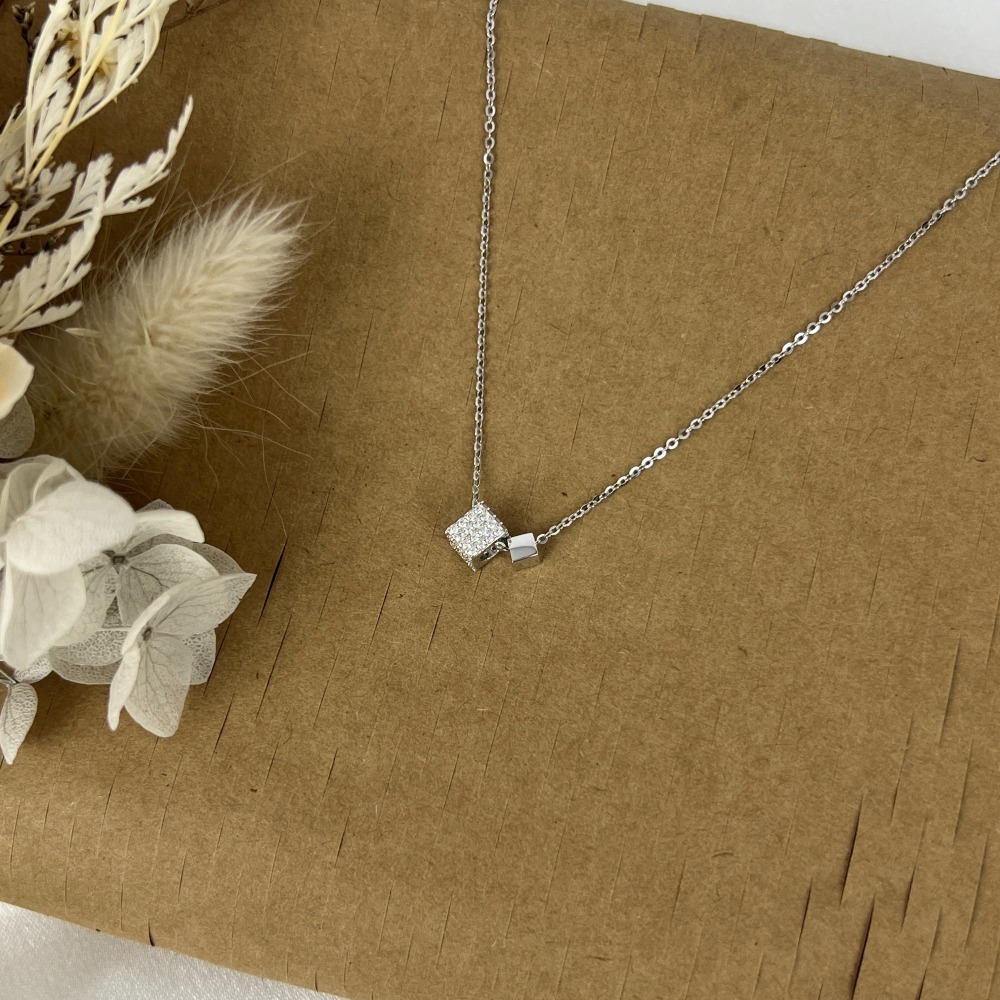 ||董飾 純銀飾品|| 925純銀- 大小方塊 鑲鑽 亮面 項鍊