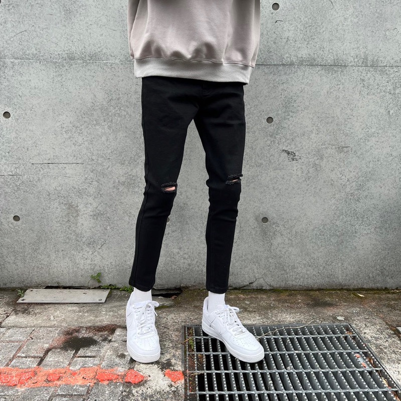 🇰🇷韓國高質感雙刀割刷破牛仔長褲 素面 刀割 刷破 男女 四季百搭 素黑 版型修身 破洞