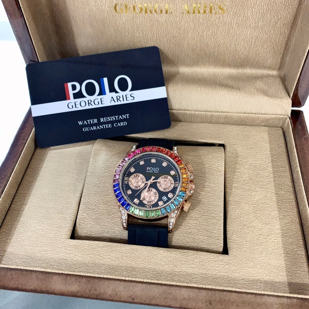 此商品為 POLO GEORGE ARIES 石英錶 彩虹鑽 真三眼計時橡膠錶