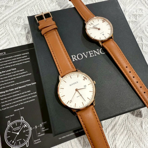 此商品為 ROVENCE 素面日期皮錶 兩地時區功能 情侶對錶禮盒組