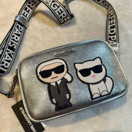 【卡爾|全新】現貨 KARL LAGERFELD 銀色亮皮 Q版人像 雙層 相機包|Little Bee 小蜜蜂精品