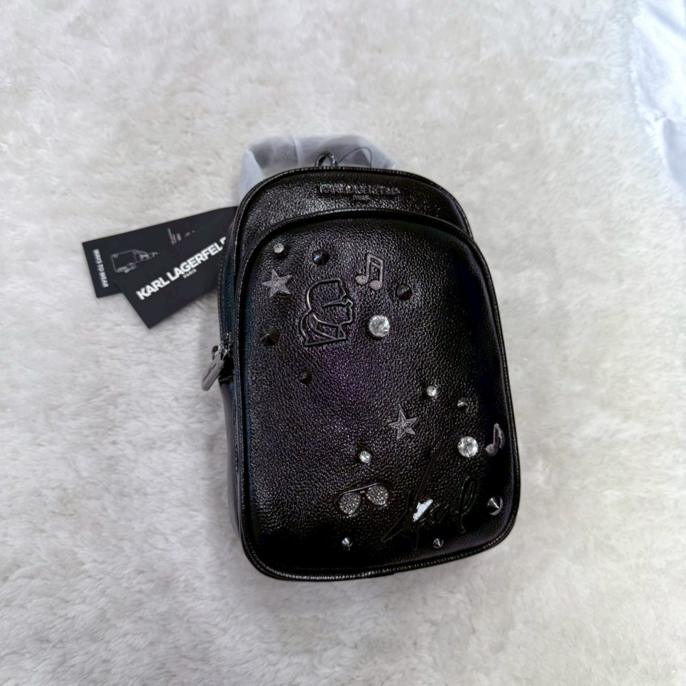 【卡爾|全新】現貨 KARL LAGERFELD 包包 胸包 亮面 金屬黑 斜背包|Little Bee 小蜜蜂精品