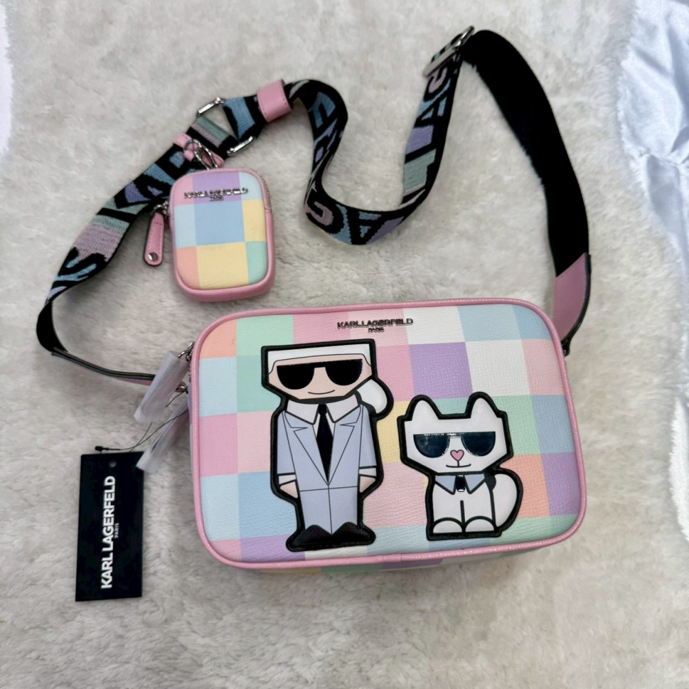 此商品為 KARL LAGERFELD 卡爾 二合一 Q版人像 彩虹格紋 相機包+零錢包