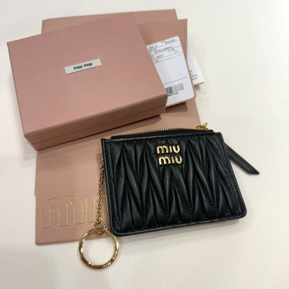 此商品為 MIU MIU 金標 羊皮抓皺款 鑰匙圈 零錢卡夾包