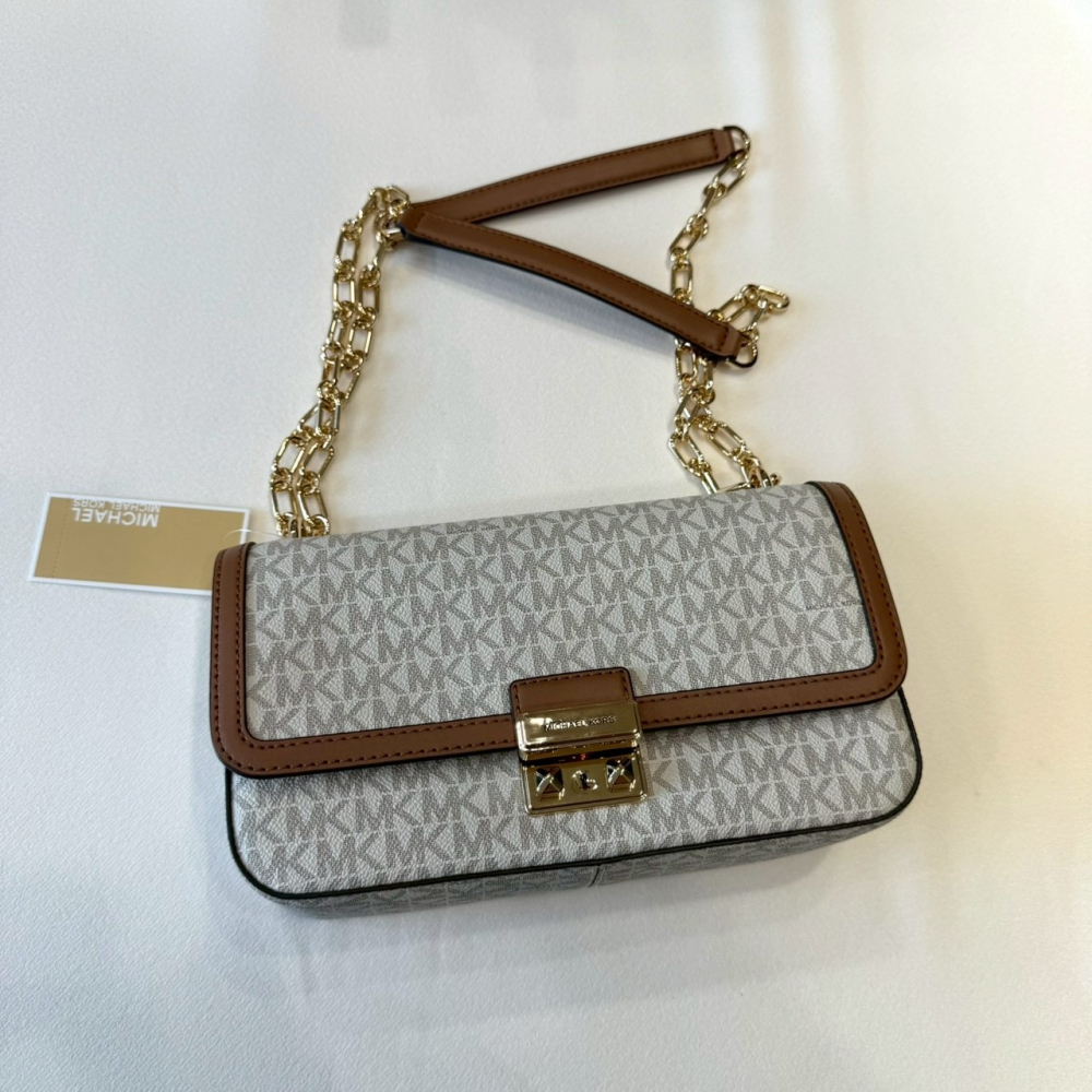 【MK|全新】現貨 MICHAEL KORS 包包 掀蓋包 金標 白滿版 鍊條 斜背包|Little Bee 小蜜蜂精品