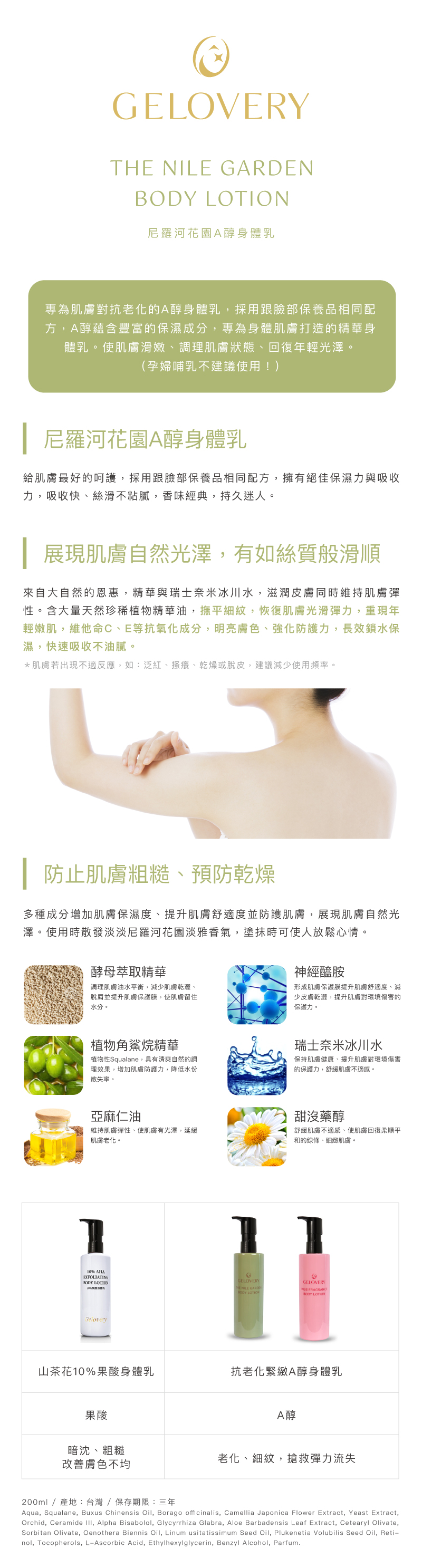 來自大自然的恩惠,精華與瑞士奈米冰川水,滋潤皮膚同時維持肌膚彈性。含大量天然珍稀植物精華油,撫平細紋,恢復肌膚光滑彈力,重現年輕嫩肌,維他命C、E等抗氧化成分,明亮膚色、強化