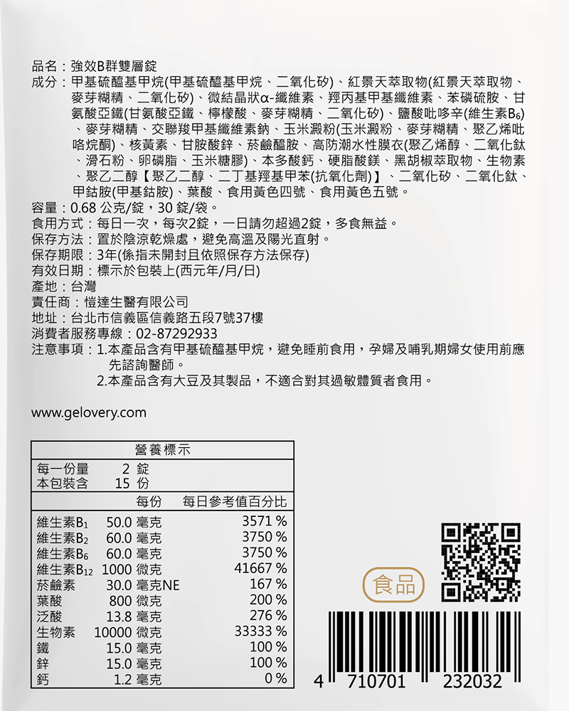 Gelovery 強效綜合B群雙層錠『 單包30顆 』(全素) 補鐵補鋅爆量添加生物素