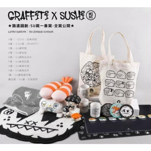 全台限量100套一番賞 於玩具店抽到 D賞SU屍娃娃 F賞滑鼠墊(上方壽司款) G賞手提帆布袋(左邊塗鴉款) I賞硅藻土杯墊(最左邊塗鴉款) 以上多帶可聊聊優惠 #路遙原創 #SU屍 #一番賞 #限量