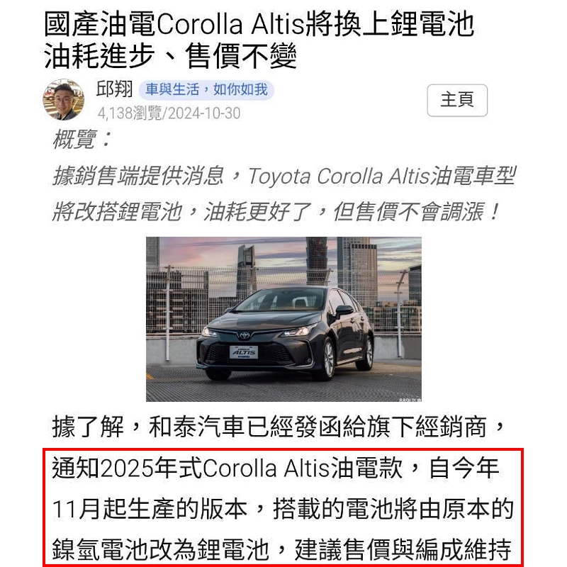 2025年後 台灣豐田 油電車動力大電池全車系改用,新款鋰離子電池,將全面淘汰舊款鎳氫電池,舊款鎳氫電池平均使用里程約10~15萬公里,車輛長期不開電池平衡容易跑掉壽命會更短,目前原廠新車保固期限內,鎳氫大電池保固情形不斷發生,更換新款鋰電池後,可有效改善舊款鎳氫電池目前的所有缺點。