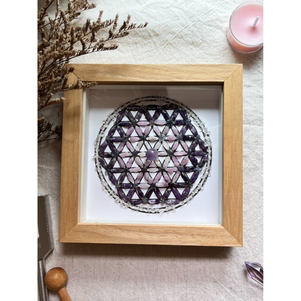 這幅水晶圖 以「生命之花」的神聖幾何為核心,象徵萬物的起源與靈性藍圖。