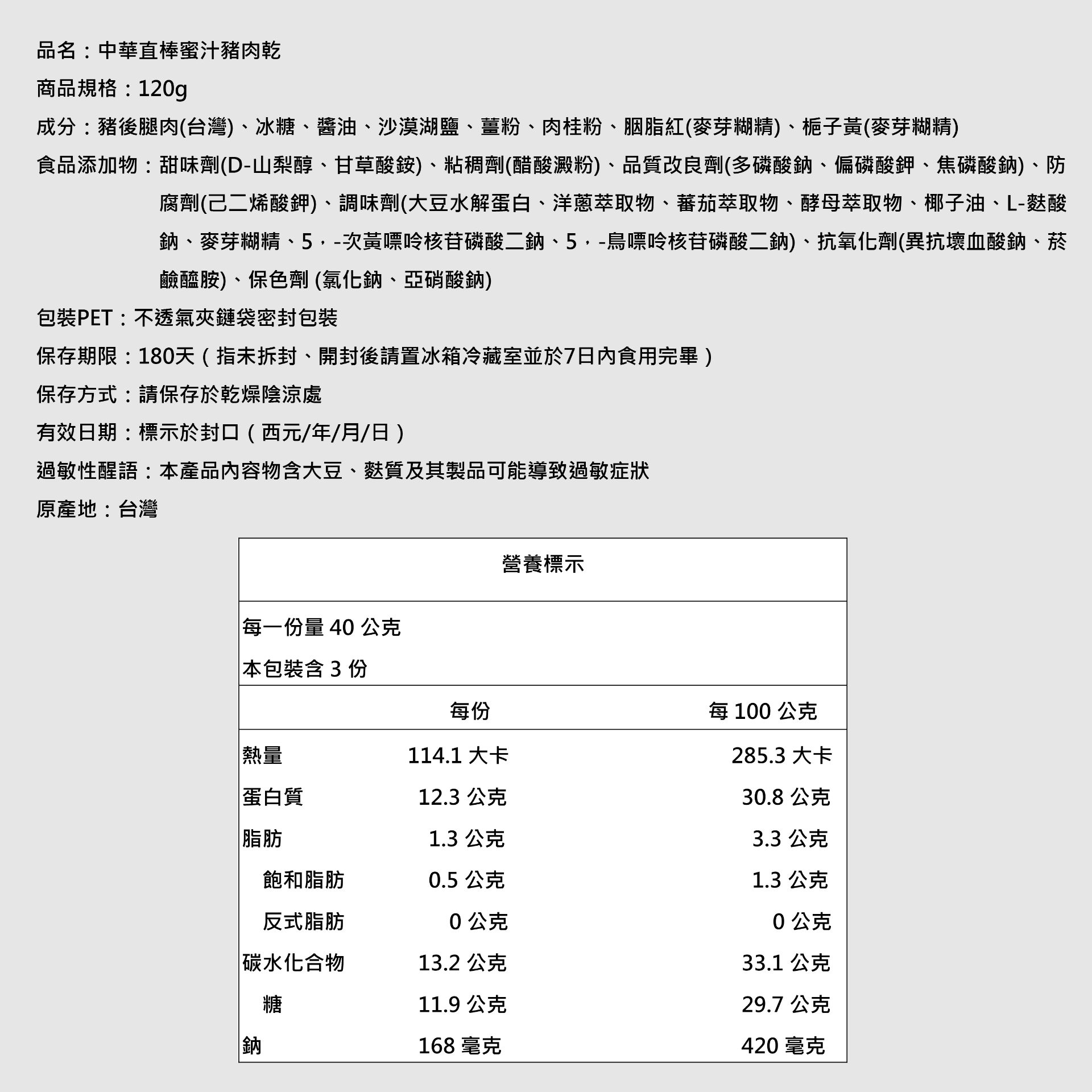 【萬味軒肉乾】中華直棒系列-【蜜汁口味單支獨立航空包裝 120g】