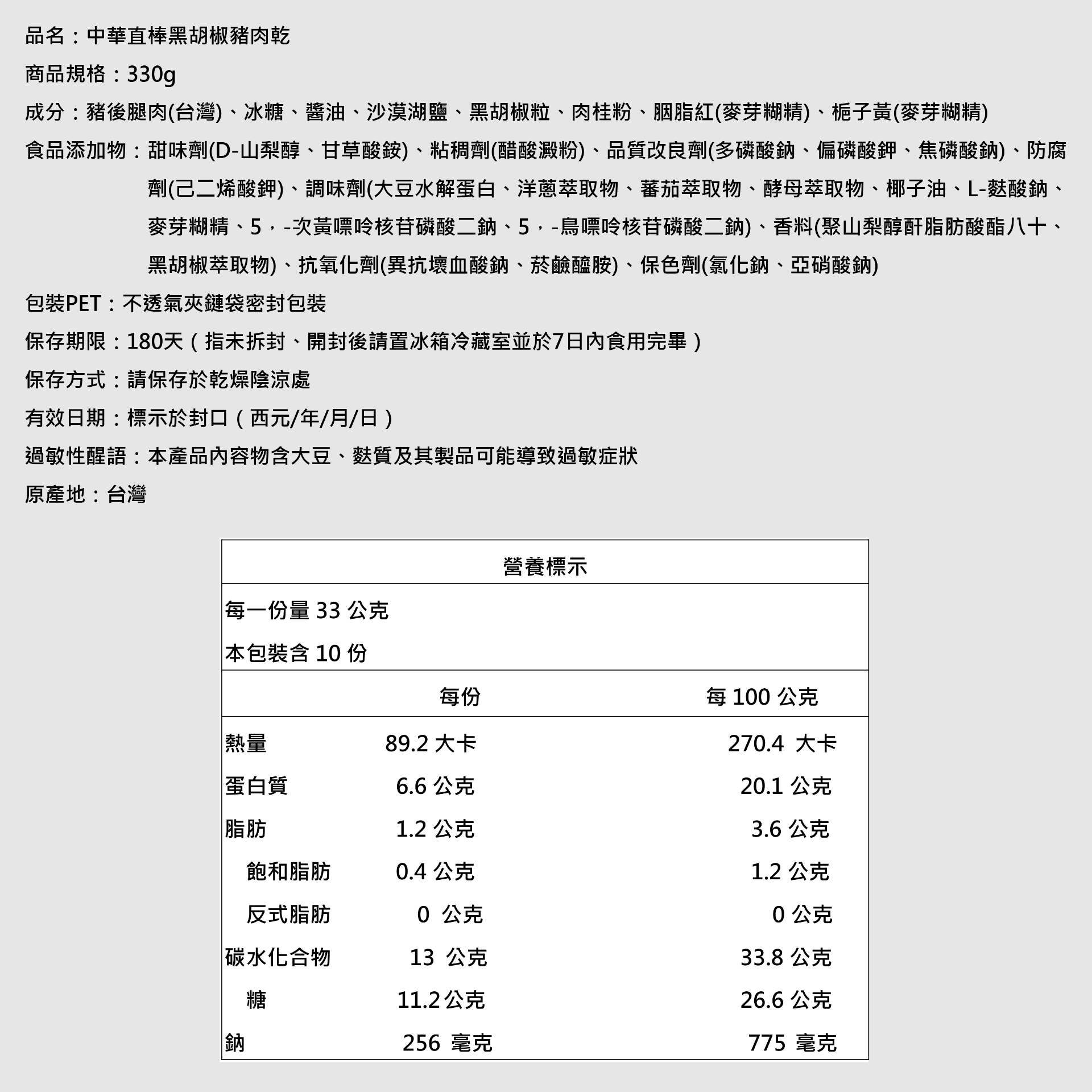 【萬味軒肉乾】中華直棒系列-【黑胡椒口味單支獨立航空包裝 330g】