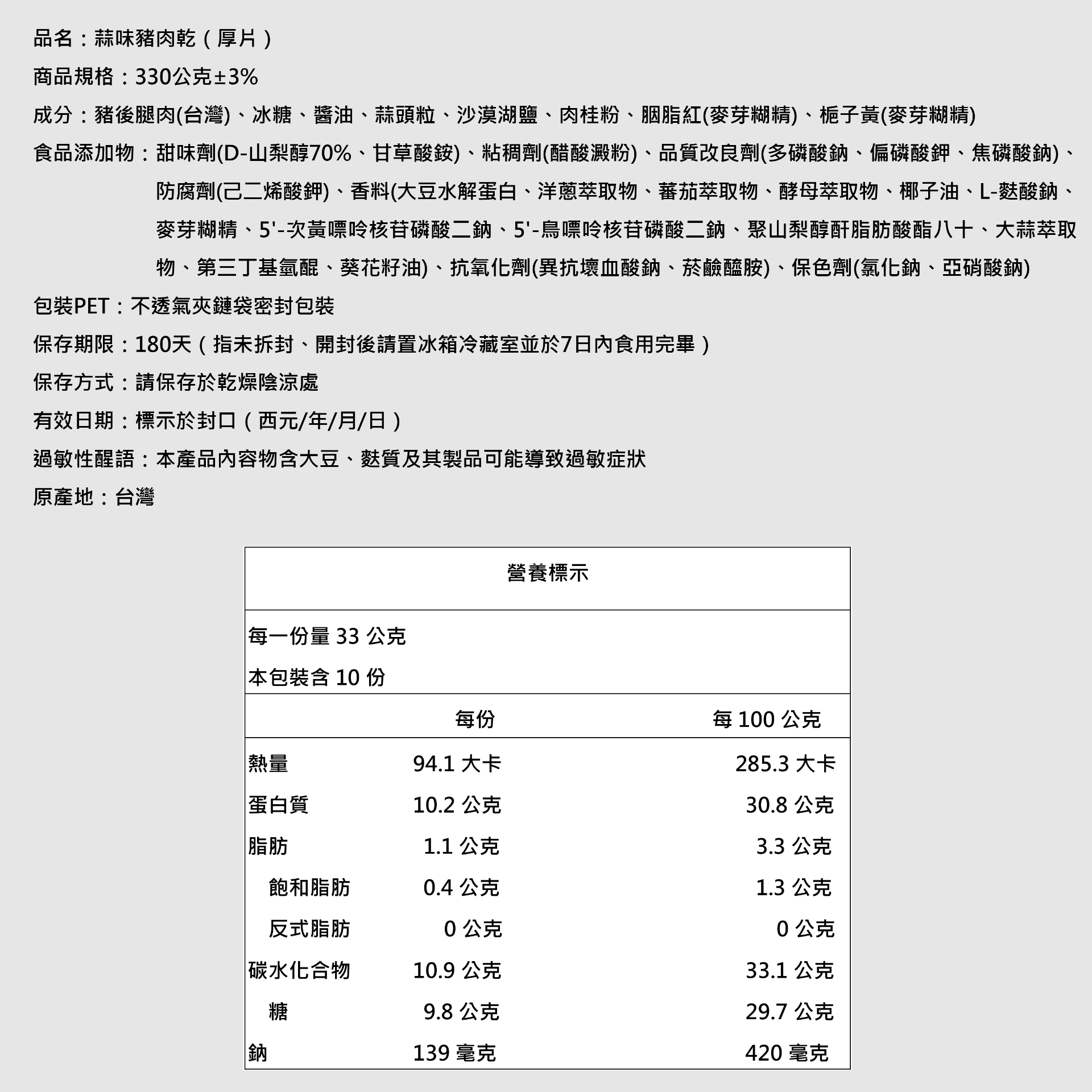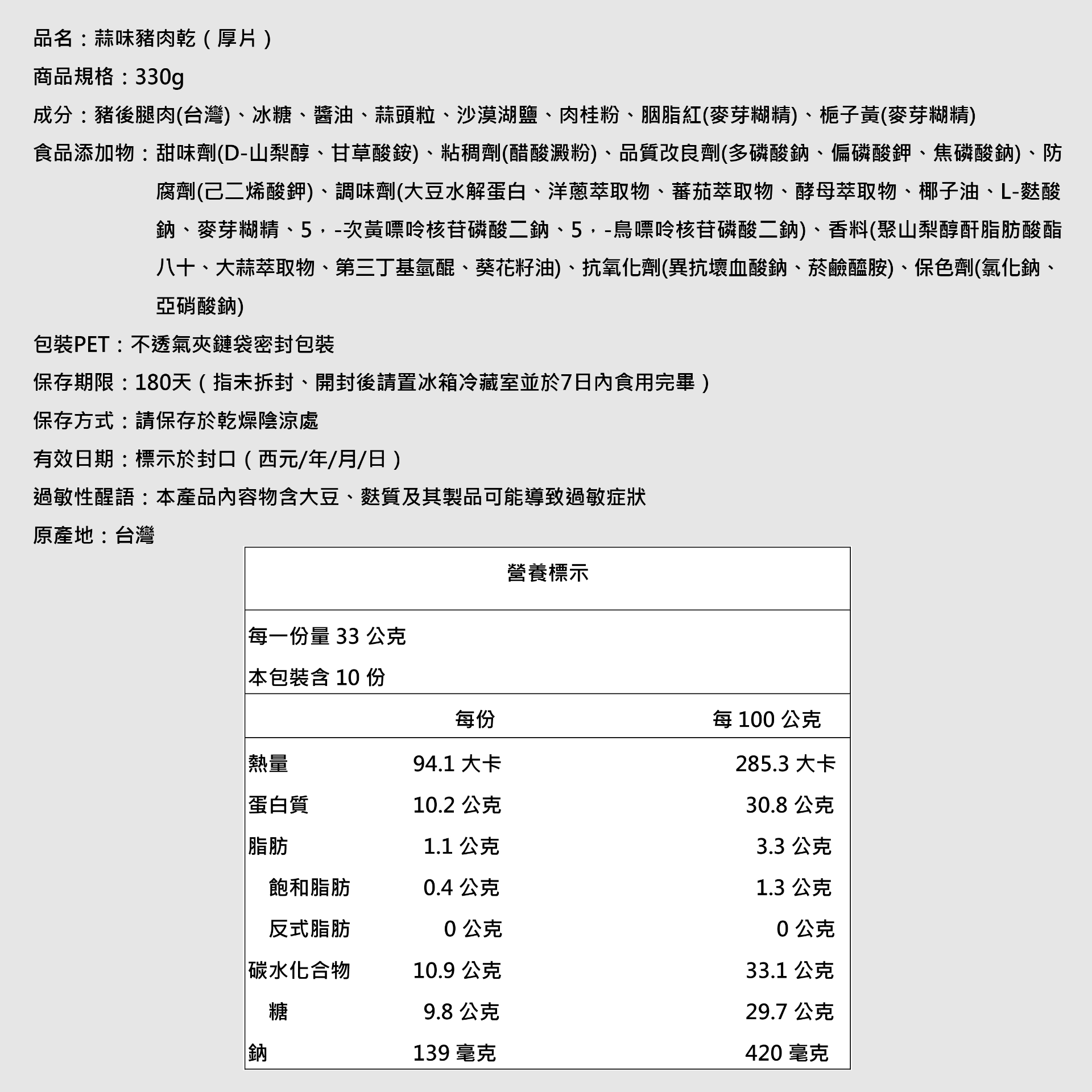 【萬味軒肉乾】厚片肉乾系列 -【蒜味口味單片獨立航空包裝 330g】