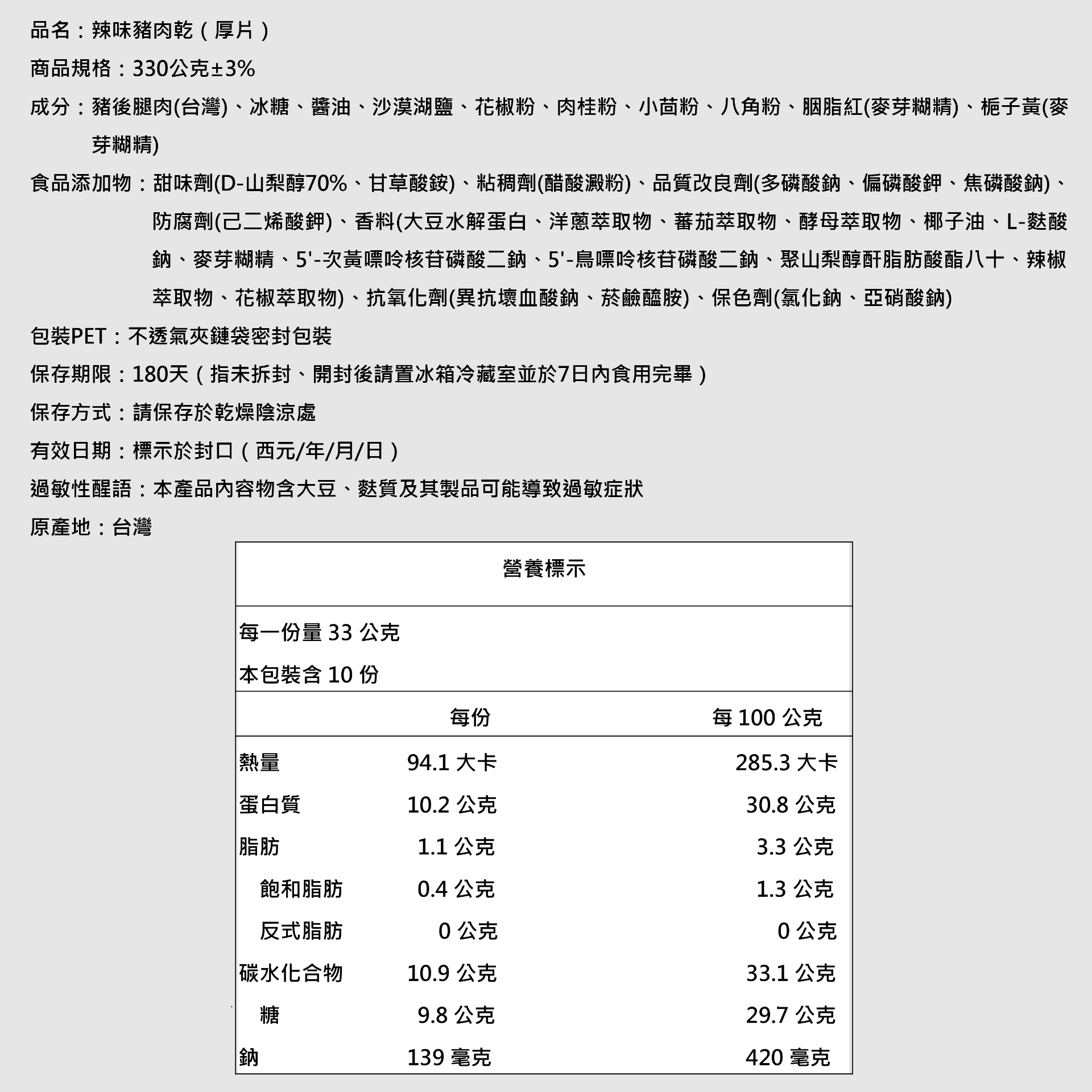 【萬味軒肉乾】厚片肉乾系列-【辣味口味單片獨立航空包裝 330g】
