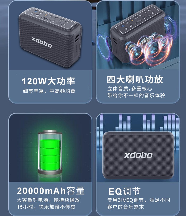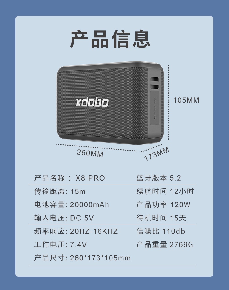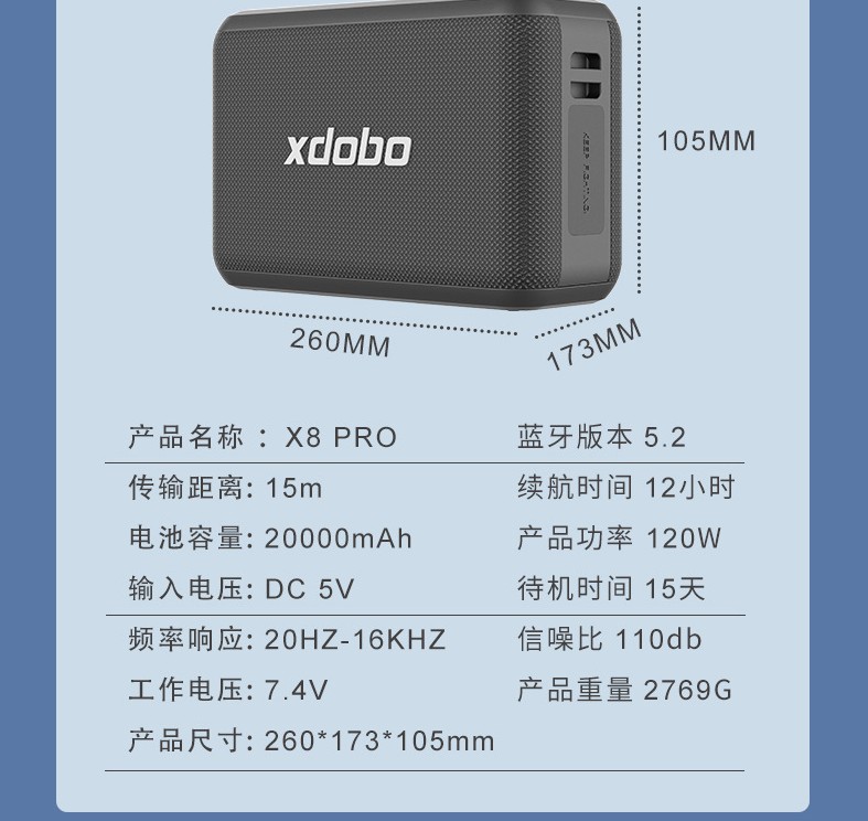 實機測試 音量與max 100w 相當 畢竟x8 max100w是4個單元喇叭+2重低音震模 可以先大致介紹 有唱歌需求 x8 pro 沒唱歌需求 x8max 首選 補充: 聲量有大些 但與100w 差沒多少 中高音 部分 有大聲一些 三段調音更為明顯 麥克風為充電式 補充說明 有x8 plus的音質 又有x8 max的大聲震撼音量 尤其三段調音 超明顯 也是商家喜歡的一個原因 可以稱得上是享受級 與king max 不遑多讓 差別就在音量 但也夠大聲了 也是商家特別強力推出的X8 系列之一