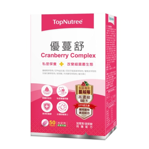 成 分:蔓越莓萃取粉(蔓越莓萃取粉、麥芽糊精)、蔓越莓萃取物、乳糖、葡萄糖、鼠尾草抽出物(鼠尾草抽出物、麥芽糊精、二氧化矽)、益生菌(乳酸菌(瑞士乳桿菌(Lactobacillus helveticus)、德氏乳桿菌乳酸亞種(Lactobacillus delbrueckii ssp. lactis)、植物乳桿菌(Lactobacillus plantarum)、發酵乳桿菌(Lactobacillus fermentum)、鼠李糖乳桿菌 (Lactobacillus rhamnosus)、副乾酪乳桿菌 (Lactobacillus paracasei))、麥芽糊精、微結晶狀α-纖維素)、葡萄皮萃取(葡萄皮萃取、麥芽糊精)、維他命C、酵母粉(含維生素B群)(含菸鹼酸、泛酸、維生素B6、維生素B2、維生素B1、葉酸、生物素)、流行鏈球菌發酵物(含透明質酸鈉)、二氧化矽、玫瑰花瓣提取物。膜衣(純水、羥丙基甲基纖維素、食用水性藍色一號、食用水性紅色七號、二氧化鈦、食用水性紅色六號)