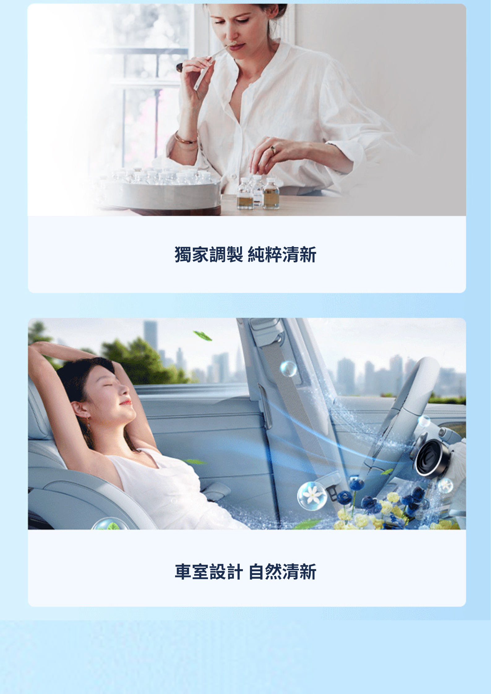 芬芳香調伴你每一次的出行!車用香氛包括車用擴香支架及補充擴香蕊心。將香氛綴點成隨行飾品,打造美妙香氛旅程香氛氣息隨著空調的循環擴散至整個車室空間。