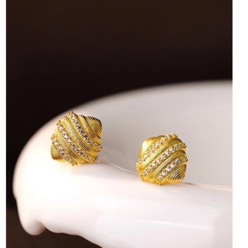 《真愛鍊Cherish 》S925純銀外真金耳環 義大利拉絲工藝閃閃發光的外觀 牛角包外型純銀耳環 鋯石耳環 鍍金耳環