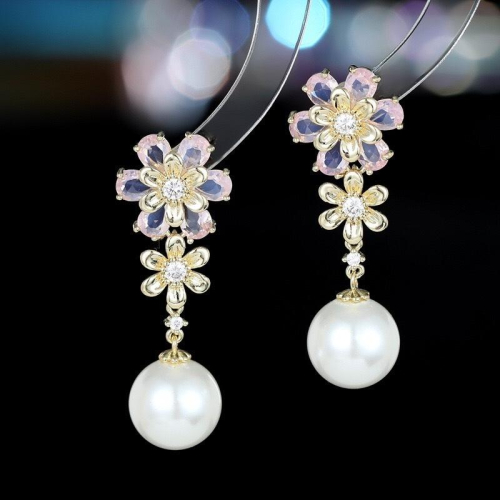 《真愛鍊Cherish》微鑲鋯石花朵貝珠高級耳環 耳針S925銀針 雙花精工鋯石的造型 重工藝精工耳環