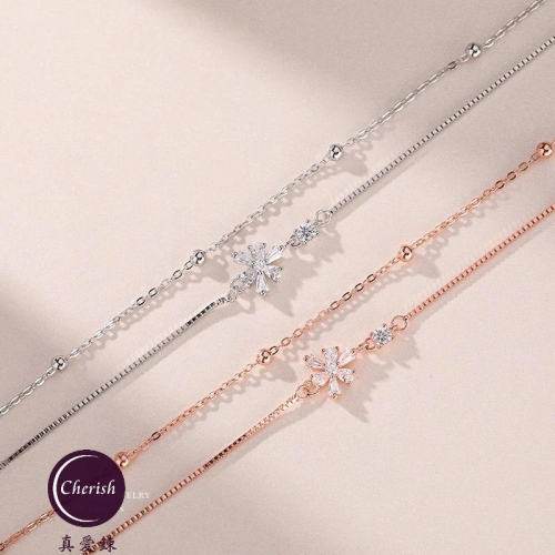 《真愛鍊Cherish》S925通體純銀手鍊 雙層鋯石櫻花造型,盒子鍊搭配十字鍊 銀飾銀樓 玫瑰金色