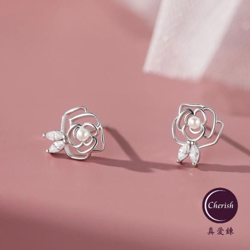 《真愛鍊Cherish 》S999通體足銀純銀耳環 微鑲鋯石山茶花造型鏤空氣質設計 銀樓銀飾