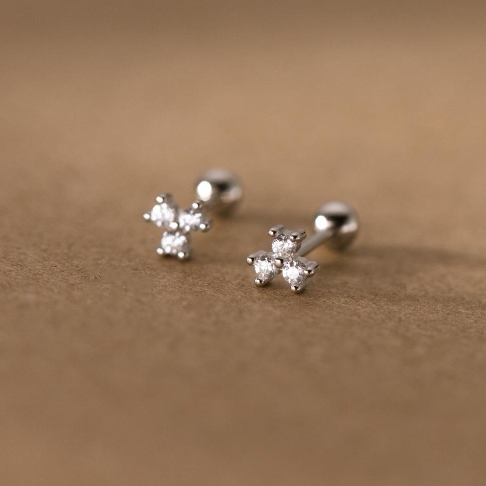 《真愛鍊Cherish 》S925通體純銀轉珠鎖珠耳環 三片花鋯石螺絲螺紋花瓣鋯石 銀樓銀飾