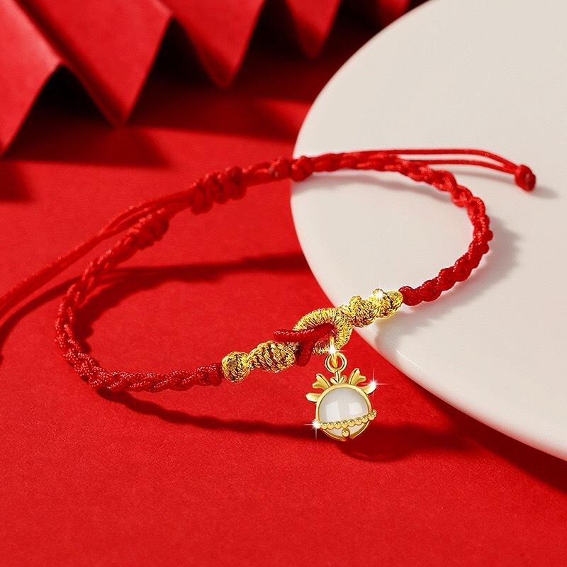 《真愛鍊Cherish 》S925通體純銀手作紅繩手鏈 搭配金龍賀歲天然和田玉造型 紅繩 福氣 文創