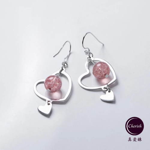 《真愛鍊Cherish 》S925通體純銀耳環 耳勾造型 天然草莓晶可愛的愛心樣式上下都是愛心喔 桃花 人緣