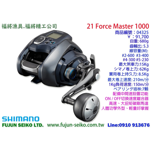 【福將漁具】Shimano電動捲線器 21 Force Master 1000
