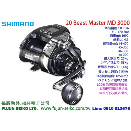 【福將漁具】Shimano電動捲線器 20 Beast Master MD3000