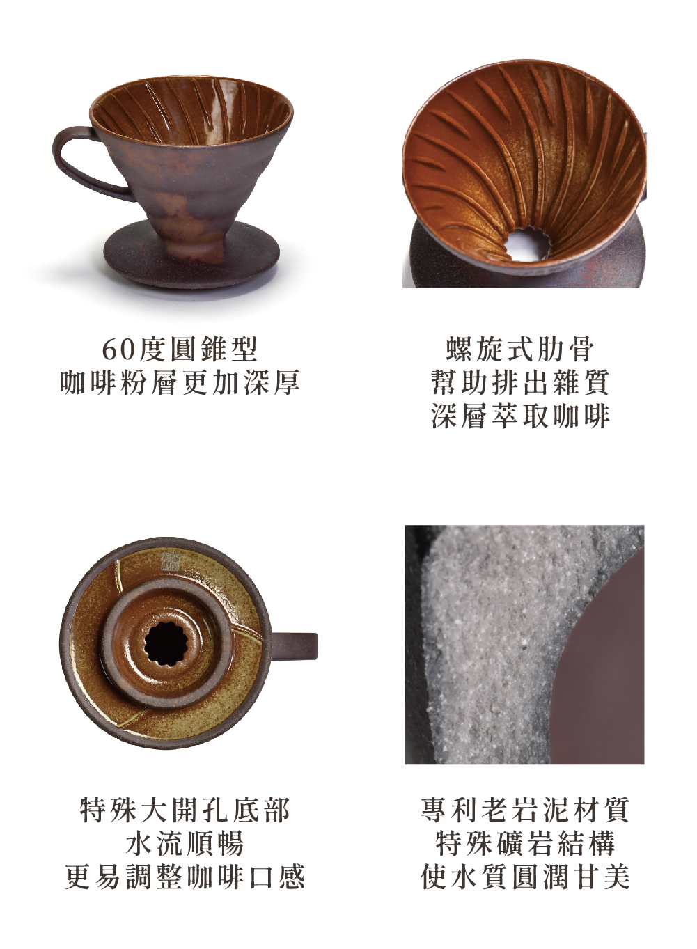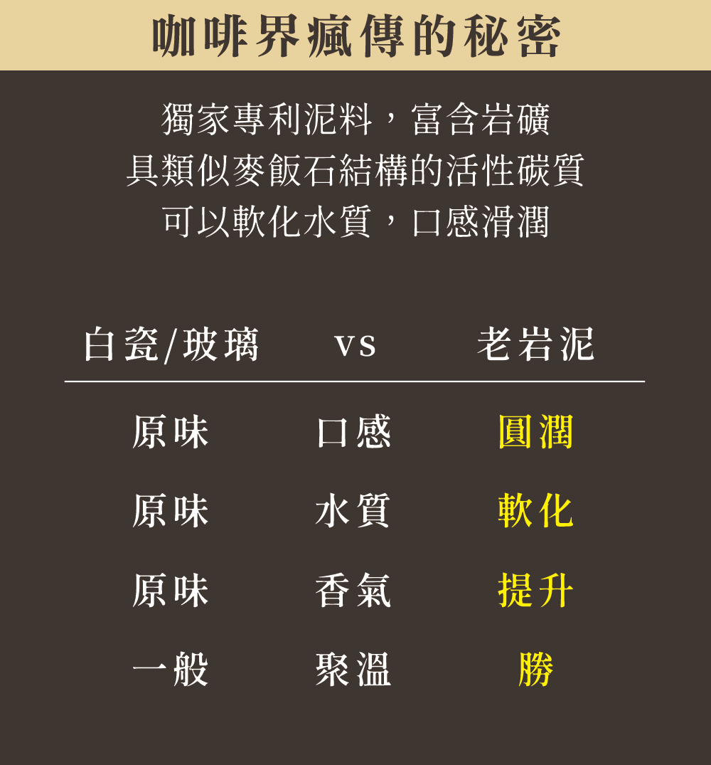 ● 老岩泥材質使水質溫潤,帶出咖啡不同層次的風味