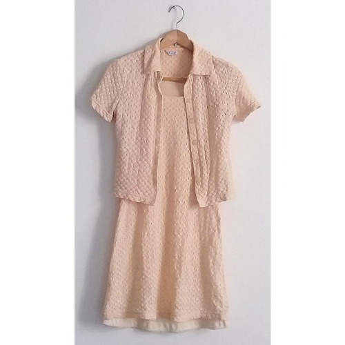 1. 連身裙: 肩寬33cm 胸寬36 腰寬33 長度62 2.上衣: 肩寬33cm 衣長40 *不議價 * 參考照片5:連身裙的右袖後上方有輕微染到較深一點的橙色 但不算明顯