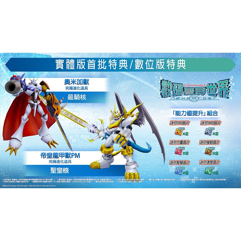 💎本賣場為正版遊戲販售通路商,請安心購買💎 💎遊戲片均全新未拆封💎 (封面包裝參考示意圖,請以實際出貨為準!) ⭐遊戲名稱:數碼寶貝世界 Next Order 中文版 ⭐遊戲類型:培育角色扮演 ⭐發售日期:2023/02/22發售 ⭐遊戲人數:1人 ⭐級別:待訂 ⚠️特典依照官方公佈為主,如數量不足將依照訂單順序配分,請提早預購 遊戲介紹: 本作為 2017 年發售的《數碼寶貝世界 -next 0rder-中文版》移植至 Nintendo Switch 與 STEAM 平台的作品 繼承「數碼寶貝世界」系列的遊戲系統,玩家可培育具有一定壽命的夥伴數碼寶貝,與他們一起探索廣大的數碼世界,並和野生數碼寶貝戰鬥 本作對應平台進行最佳化調整,並有 230 隻以上的數碼寶貝登場,玩家亦可同時培育 2 隻夥伴數碼寶貝  除了承襲前作中的「培育」、「戰鬥」和「冒險」,本次更新增「入門模式」和「跑步功能」。降低遊玩門檻並提升操作體驗,讓想專心享受劇情的玩家更能輕鬆體驗到遊戲的樂趣 ⚠️本產品不含主機、收納包、Joy-Con充電握把、方向盤等其他配件,如有需要請在本賣場的其他商品頁面選購 https://s-cf-tw.shopeesz.com/file/tw-11134202-7r98u-lmq42w474za1c8 https://s-cf-tw.shopeesz.com/file/tw-11134202-7r98p-lmq42wb4dyu313 https://s-cf-tw.shopeesz.com/file/tw-11134202-7r98s-lmq42wi23tll4b https://s-cf-tw.shopeesz.com/file/tw-11134202-7r98o-lmq42wu9lyft67