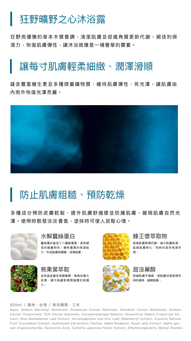 狂野而優雅的草本木質香調,清潔肌膚並促進角質更新代謝, 絕佳的保濕力,恢復肌膚彈性,讓沐浴就像是一場奢華的饗宴。