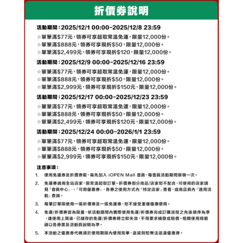 為完善您的購物體驗,iOPEN Mall 已於 2024 年 11 月 1 日更新「iOPEN Mall 服務條款」,並於 2024 年 11 月 21 日更新「隱私權政策」,相關條款及政策更新內容如下。如對本次調整有異議,得於 2025 年 12 月 31 日前,通知本公司終止契約。若未於前述期限前提出異議並通知本公司終止契約者,則視為同意。十分感謝您的支持,iOPEN Mall 將提供給您更優質的服務。