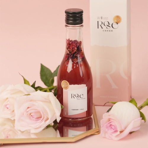 嚴選來自 屏東在地栽種可食用有機玫瑰花瓣,花香細緻而不濃烈,與純正蜂蜜及100%天然釀造醋融合,釀造出酸中帶甜、甜而不膩的口感。