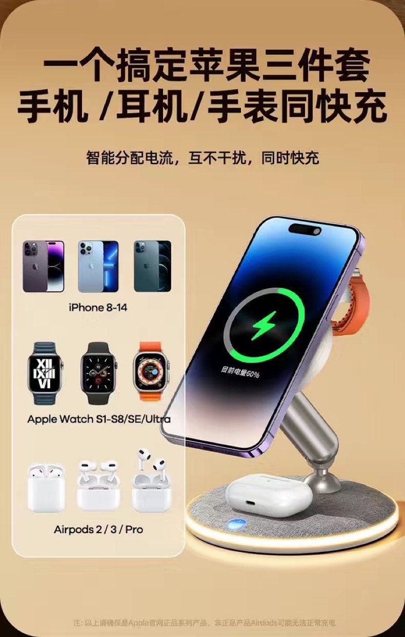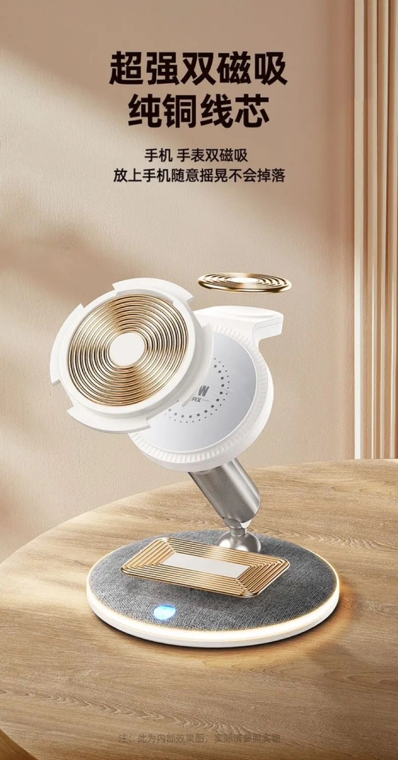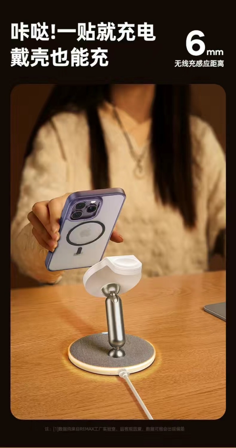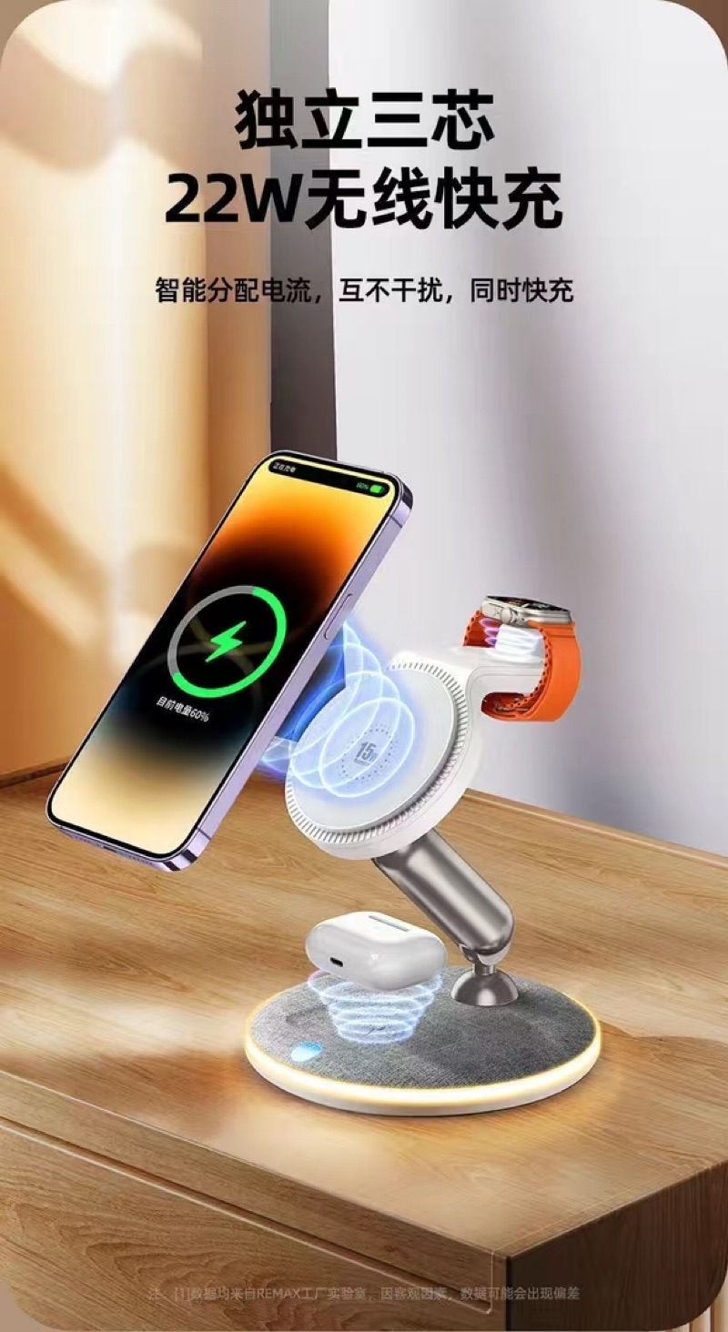 REMAX新款無線充電器三合一手機手錶耳機同時充磁吸magsafe快充適用蘋果白色柔光夜燈