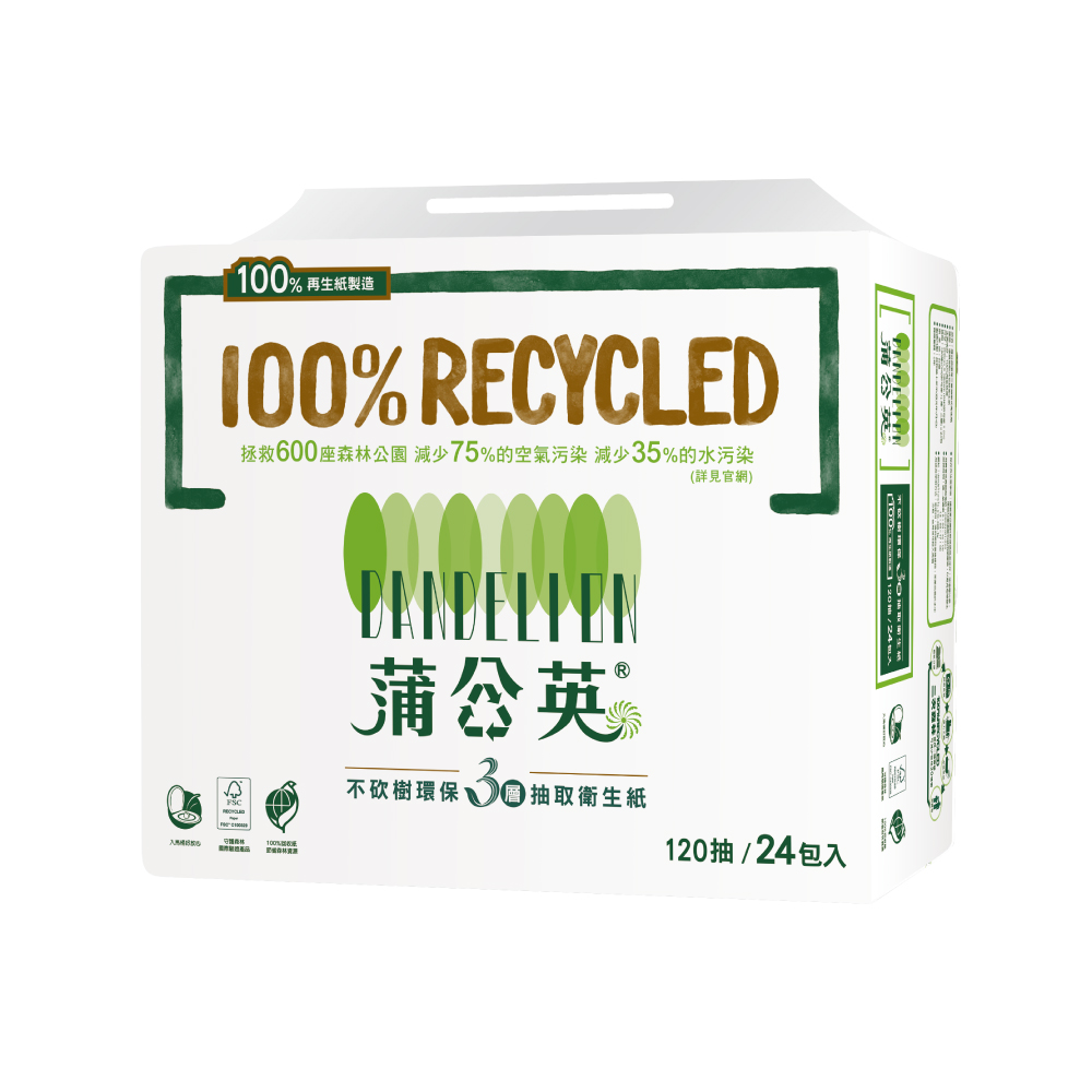 品名: 蒲公英環保抽取式衛生紙 種類: 連續抽取式花紋衛生紙 主要成分: 100%再生紙漿 尺寸: 200mm X 180mm (CNS許可差+-5%) 規格: 120抽 (CNS許可差+7、-4抽,三層)X24包 原產地: 台灣 製造日期: 如包裝上所示(西元年/月/日) 有效期間: 5年 保存及注意事項: 請將產品置於乾燥通風處保存,並遠離火源;應使幼童遠離包裝用塑膠袋,以避免危險發生。 消費者免費服務電話: (0800)261-222 服務時間: 週一至週五 9:00-12:00 / 13:00-17:00 網址: dandelionclc.clc.com.tw 用途及使用方法: 拆開包裝後用於個人衛生維護、居家環境清潔及廁衛用,本產品於水中易分散,適量使用後可丟入馬桶。