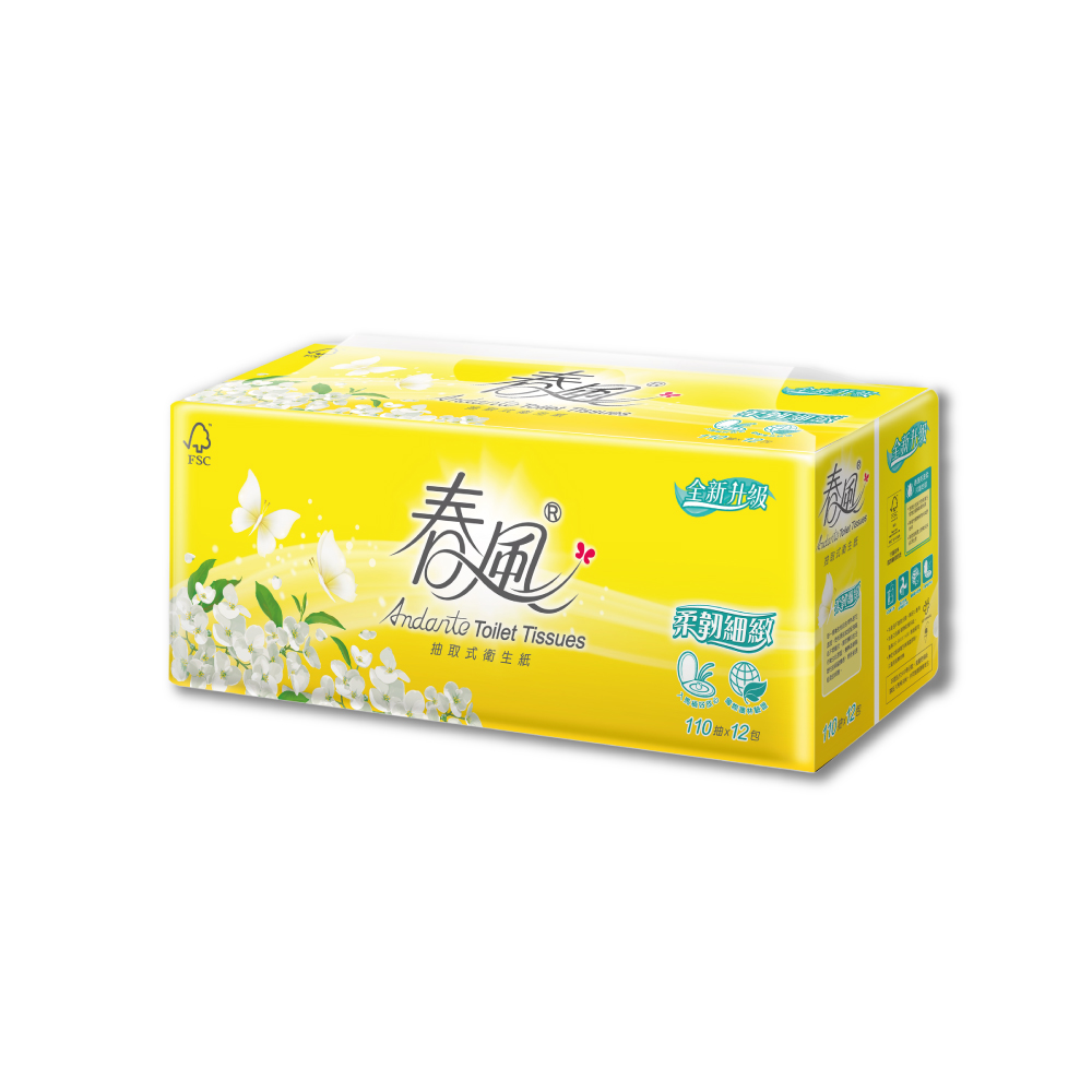品名: 春風柔韌細緻抽取式衛生紙 種類: 連續抽取式花紋衛生紙 主要成分: 100%原生紙漿 尺寸: 200mm X 195mm (CNS許可差+-5%) 規格: 110抽(CNS許可差+6、-3抽,雙層)X12包 原產地: 台灣 製造日期: 如包裝上所示(西元年/月/日) 有效期間: 5年 保存及注意事項: 請將產品置於乾燥通風處保存,並遠離火源;應使幼童遠離包裝用塑膠袋,以避免危險發生。 消費者免費服務電話: (0800)261-222 服務時間: 週一至週五 9:00-12:00 / 13:00-17:00 網址: www.andante.com.tw 用途及使用方法: 拆開包裝後用於個人衛生維護、居家環境清潔及廁衛用,本產品於水中易分散,適量使用後可丟入馬桶。