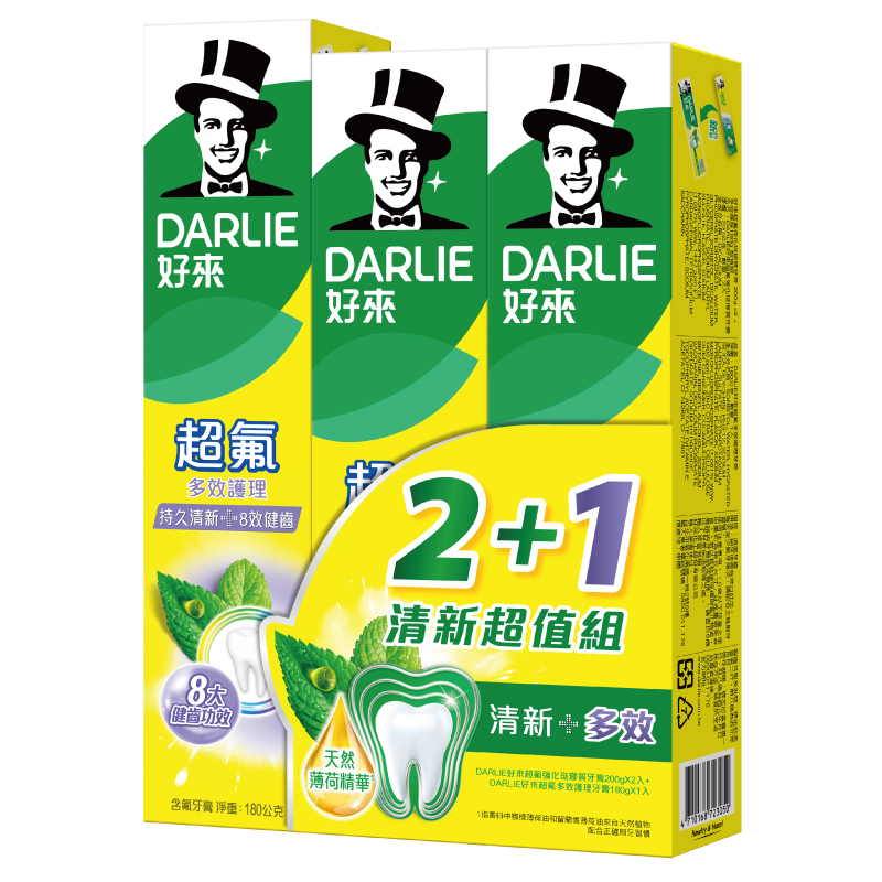 DARLIE好來超氟多效護理牙膏 180g 持久清新 + 8大健齒功效 1. 幫助去除牙菌斑 2. 幫助 保持牙齦健康 3. 清潔牙縫間污垢 4. 降低牙周病發生率 5. 對抗酸蝕 6. 幫助防蛀 7. 潔白牙齒 8. 清新口氣