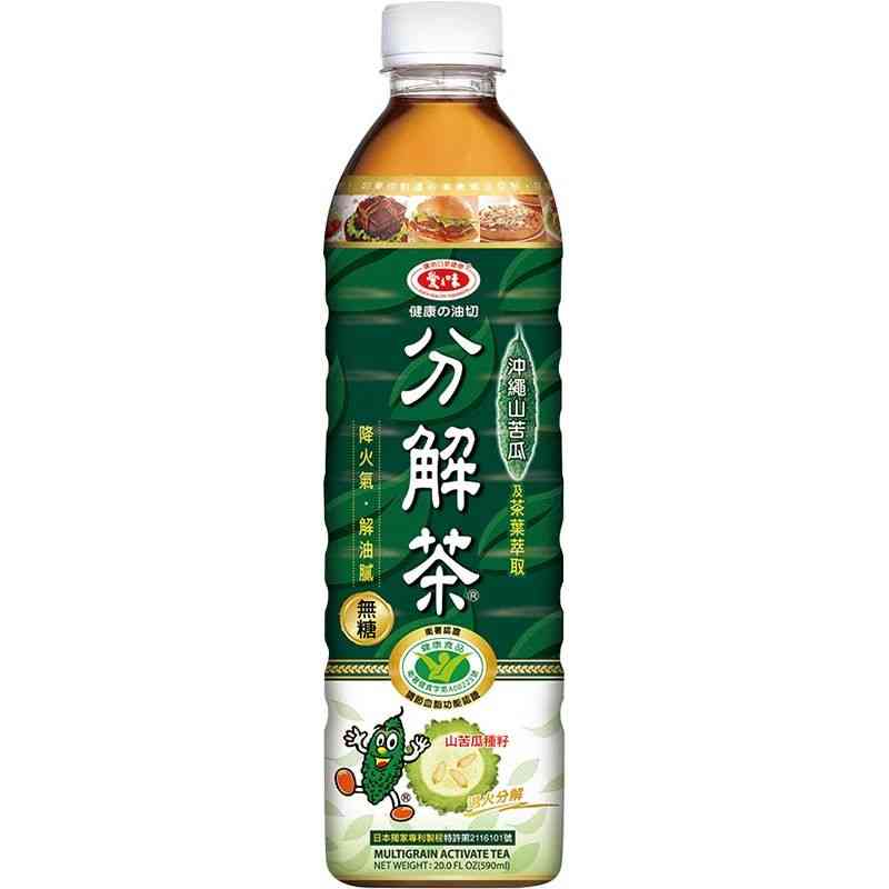 1. 混和多種茶葉,以完美比例呈現多層次濃厚茶香,好喝順口不苦澀 2. 日本獨家專利技術萃取沖繩苦瓜,保留苦瓜多種好處,更去除了苦味。 3. 每瓶8-11g的膳食纖維,提供一天所需膳食纖維的50%,能促進腸道溫和蠕動, 有效做好體內環保。 4. 衛署健食字第A00225號 保健功效敘述: (一)調節血脂功能認證: 1.有助於降低血中低密度脂蛋白膽固醇。 2.有助於增加血中高密度脂蛋白膽固醇。 (二)不易形成體脂肪功能認證: 經動物實驗結果證實:有助於減少體脂肪之形成。在嚴謹的營養均衡與熱量控制,以及適當的運動條件下,適量攝取本產品有助於不易形成體脂肪。 建議攝取量:建議每日飲用 590 毫升。 ◎ 請洽詢醫師或營養師有關飲用本產品之意見。 ◎ 均衡的飲食及適當的運動為身體健康之基礎。 ◎ 本產品僅供保健用,請依建議攝取量食用。 ◎ 警語:本產品含有菊苣纖維,飲用後會促進腸道蠕動,並產生脹氣及排氣等現象,若有不適者,請停止飲用。 5. 注意事項及警語: ◎ 保證不加防腐劑、不加人工色素 ◎ 請勿置於陽光直射處或高溫場所及避免碰撞。 ◎ 本產品使用茶葉萃取及茶粉製造,若有底部沉澱產生或 顏色變深情形,敬請搖勻飲用。 ◎ 本產品添加膳食纖維,長期冷藏或冷凍易產生纖維沉澱,敬請搖勻飲用。 ◎ 開瓶後請冷藏,並建議儘速飲用完畢。 營養標示 每一份量本包裝含295毫升本包裝含2份 每份每100毫升 熱量 11.8大卡5.0大卡 蛋白質 0.0公克0.0公克 脂肪 0.0公克0.0公克  反式脂肪 0.0公克0.0公克  膽固醇 0.0公克0.0公克 碳水化合物 6.2公克2.1公克 糖 0.0公克0.0公克 膳食纖維 5.0公克1.7公克 鈉 44毫克 15毫克 營養標示數據若與包裝上略有差異時,以實際包裝上標示為準