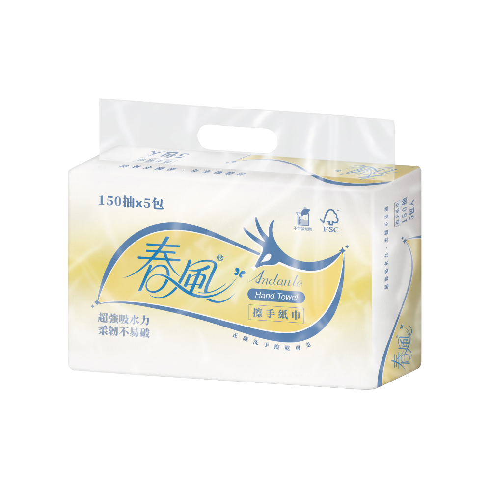 品名: 春風抽取式擦手紙巾 主要成分: 100%原生紙漿 尺寸: 230mm X 210mm (CNS許可差+-5%) 規格: 150抽 (CNS許可差+9、-3抽,單層)X5包 原產地: 台灣 製造日期: 如包裝上所示(西元年/月/日) 有效期間: 5年 保存及注意事項: 請將產品置於乾燥通風處保存,並遠離火源;應使幼童遠離包裝用塑膠袋,以避免危險發生。 消費者免費服務電話: (0800)261-222 服務時間: 週一至週五 9:00-12:00 / 13:00-17:04 網址: www.andante.com.tw 用途及使用方法: 拆開包裝後用於個人衛生維護及居家環境清潔用,本產品於水中無法分散,請勿丟入馬桶。