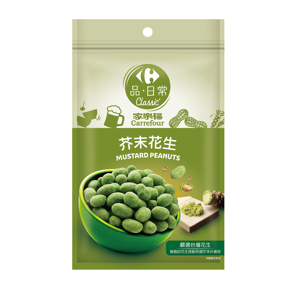 1.特選花生,每一顆紮實又飽滿。2.特調芥末粉帶有微微的嗆辣感。3.袋子採夾鏈袋設計,開封後還能即時鎖住風味。